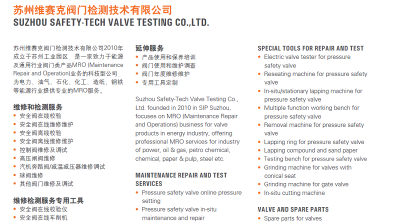 SGS下屬子公司蘇州維賽克閥門檢測技術(shù)有限公司是一家致力于能源及通用行業(yè)閥門類產(chǎn)品MRO(Maintenance Repair and Operation)業(yè)務(wù)的科技型公司,為電力、汽油、石化、化工、造紙、鋼鐵等能源行業(yè)提供專業(yè)的MRO服務(wù)。維修和檢測服務(wù)包括:安全閥在線校驗;安全閥在線維修維護;安全閥離線校驗;安全閥離線維修維護;控制閥維修及調(diào)試;高壓閘閥維修;汽機旁路閥/減溫減壓器維修調(diào)試;球閥維修;其它閥門維修及調(diào)試。