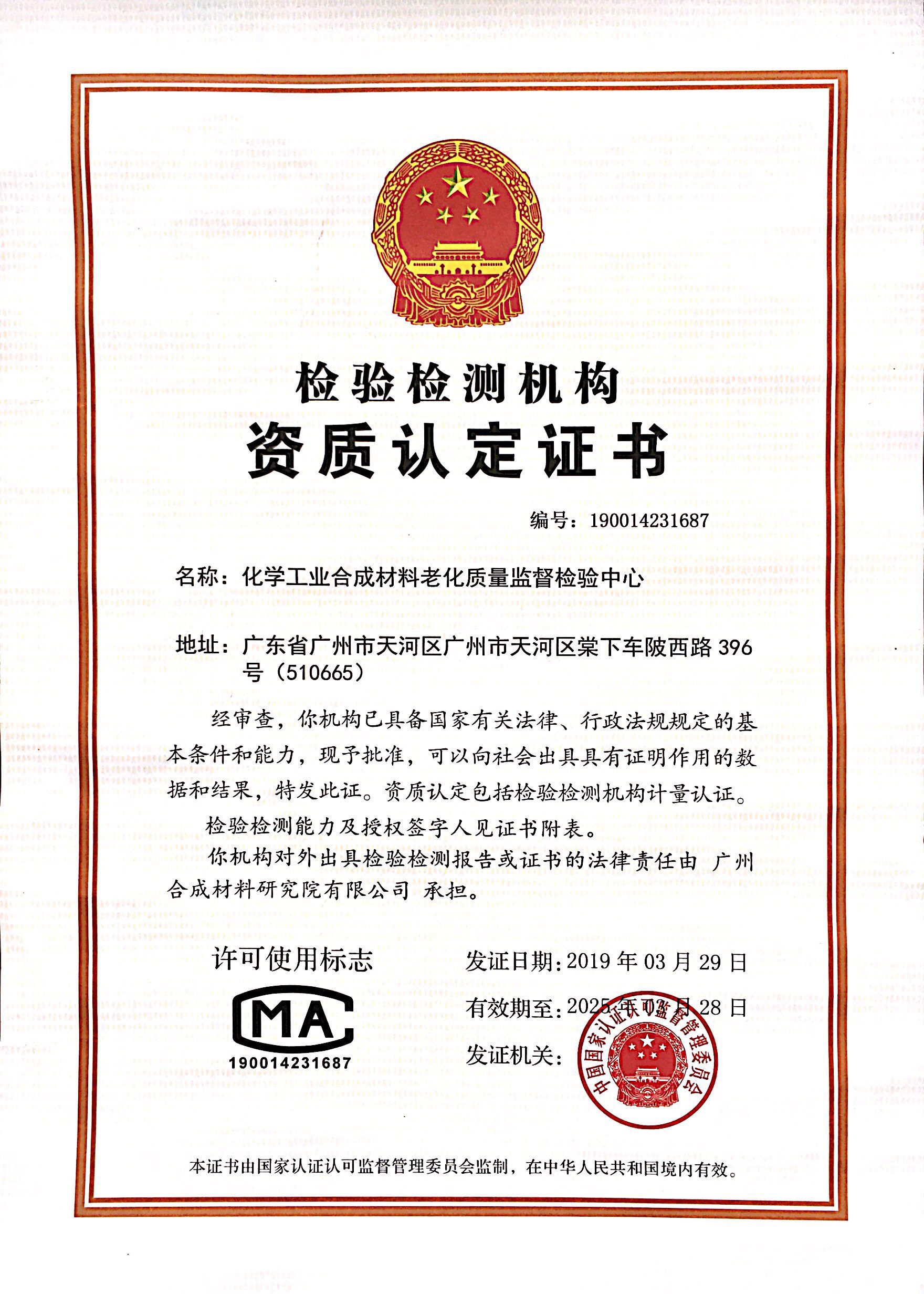 國家材料老化及壽命評估檢驗中心 ,化學工業(yè)合成材料老化質量監(jiān)督檢驗中心。 該中心是通過中國合格評定國家認可委員會實驗室認可(CNAS L1135 )和國家計量認證( CMA190014231687 )的具有公正地位的第三方檢測機構??蓪Ω鞣N高分子材料(塑料、橡膠、涂料、膠黏劑)及其制品進行性能檢測、抗老化測試以及對化學品危險性鑒定分類。 工業(yè)(合成材料老化)產(chǎn)品質量控制和技術評價實驗室, 該實驗室資質是通過國家工業(yè)和信息化部核定,產(chǎn)品質量控制和技術評價能力居全國領先水平,并在推動產(chǎn)品開發(fā)品種、提升質量、創(chuàng)建品牌、改善服務中發(fā)揮重要作用的工業(yè)產(chǎn)品質量檢驗與評價技術服務機構。 以上檢驗中心及技術評價實驗室隸屬于廣州合成材料研究院有限公司。成立于 1961 年,原名為化學工業(yè)部合成材料老化研究所, 1993 年更名為化學工業(yè)部合成材料研究院, 1999 年 7 月加入中國藍星(集團)股份有限公司后改為現(xiàn)名,是國家級高新技術企業(yè),廣東省首批新型研發(fā)機構和廣州市首批創(chuàng)新標桿試點企業(yè)。 是專業(yè)從事高分子材料老化與防老化研究、性能檢測及老化試驗方法制修訂的權威機構。檢測中心擁有先進的試驗儀器,可按國際標準( ISO )、國家標準( GB )、 ASTM 、 DIN 和 JIS 等標準進行各種合成材料及其制品的老化試驗、性能檢測;可進行合成材料的儲存壽命推算和熱指數(shù)測定等分析研究。