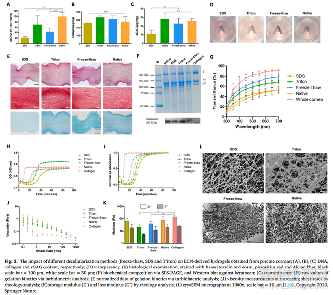 如前所述,功能組織修復(fù)領(lǐng)域術(shù)語(yǔ)的方法之一集中在使用由生物材料制成的支架。這些生物材料可歸類為合成材料或從生物來(lái)源收集的自然材料。ECM衍生的生物材料是天然來(lái)源的生物材料的一個(gè)例子。這些材料可以包括完整的細(xì)胞外基質(zhì)提取物或純化的細(xì)胞外基質(zhì)成分,如I型膠原、層粘連蛋白、纖維連接蛋白或透明質(zhì)酸。合成的材料可以作為模板,為功能性組織修復(fù)提供重要的信號(hào)分子。圖3描述了物理和化學(xué)脫細(xì)胞過(guò)程對(duì)分離的ECM的機(jī)械和物理化學(xué)性能的影響的比較。圖4展示了組織脫細(xì)胞及其形態(tài)和物理化學(xué)特征的例子。